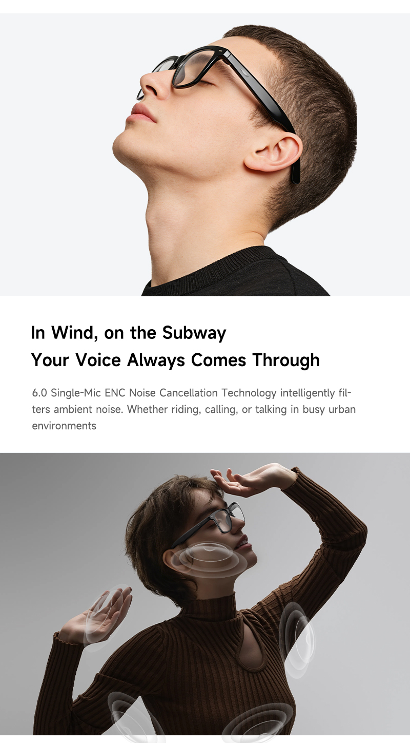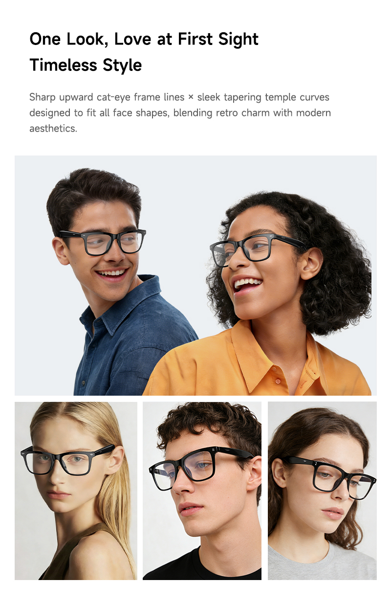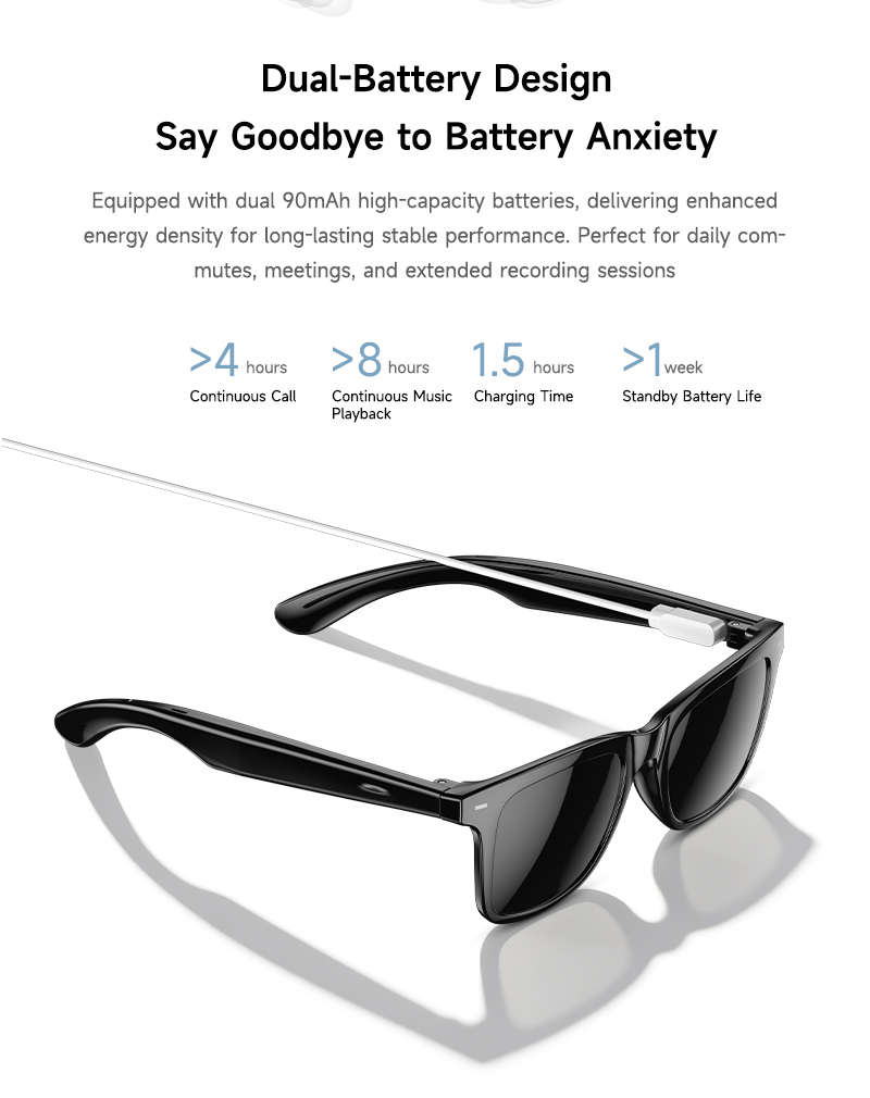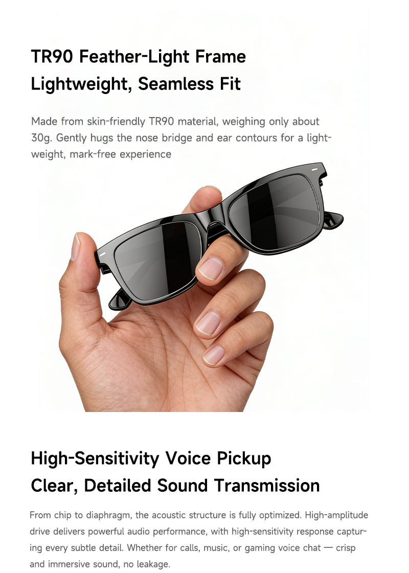 These AI smart audio glasses combine open-ear listening, Bluetooth 5.4 connectivity, and intelligent voice interaction in a lightweight TR90 frame. Equipped with ENC noise cancellation, they deliver clear calls even in noisy environments like commuting or cycling. The dual 90mAh battery design ensures long-lasting performance for music and calls. With auto power on/off via hall sensor, seamless connection, and touch control, they provide a truly hands-free experience. Ideal for travel, business