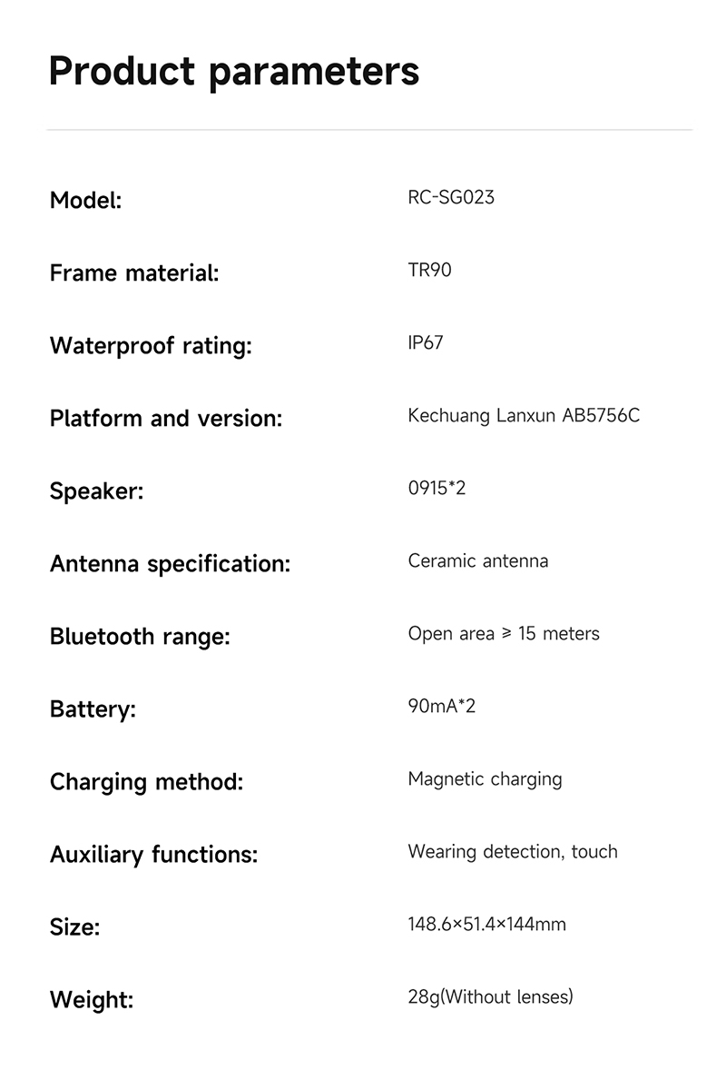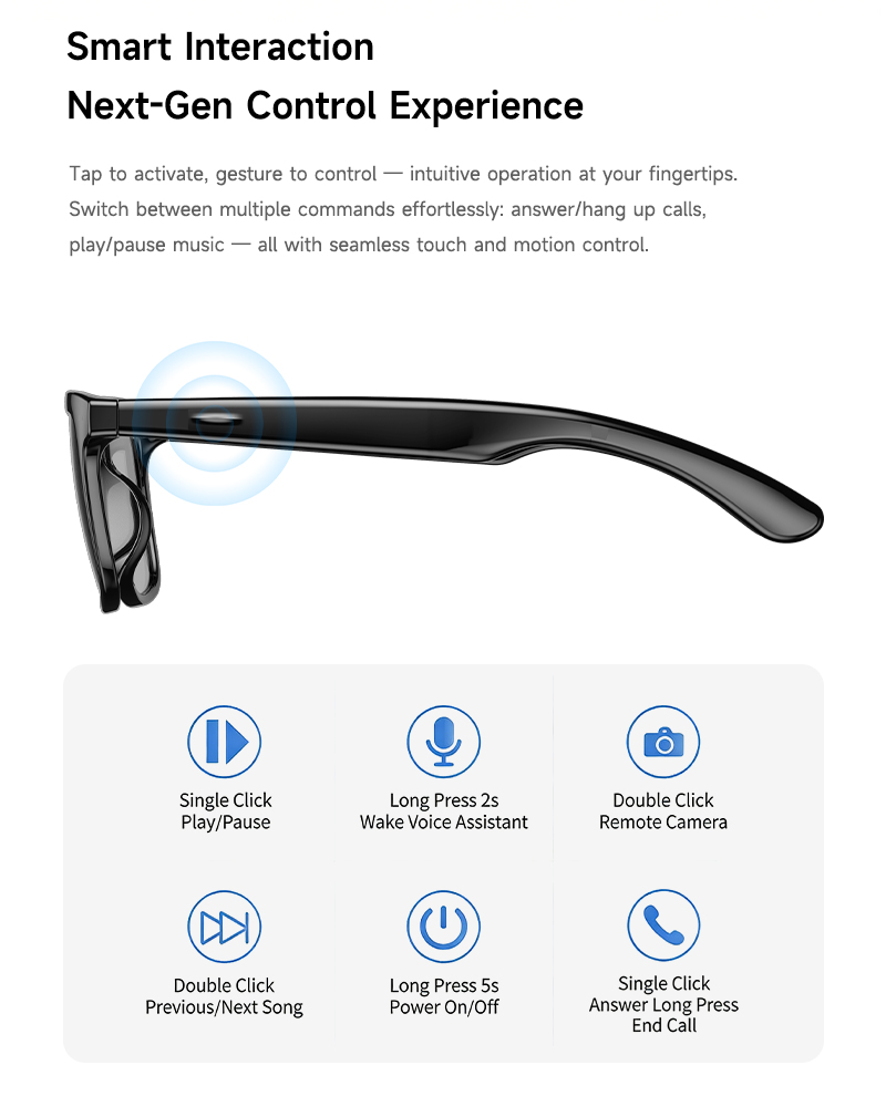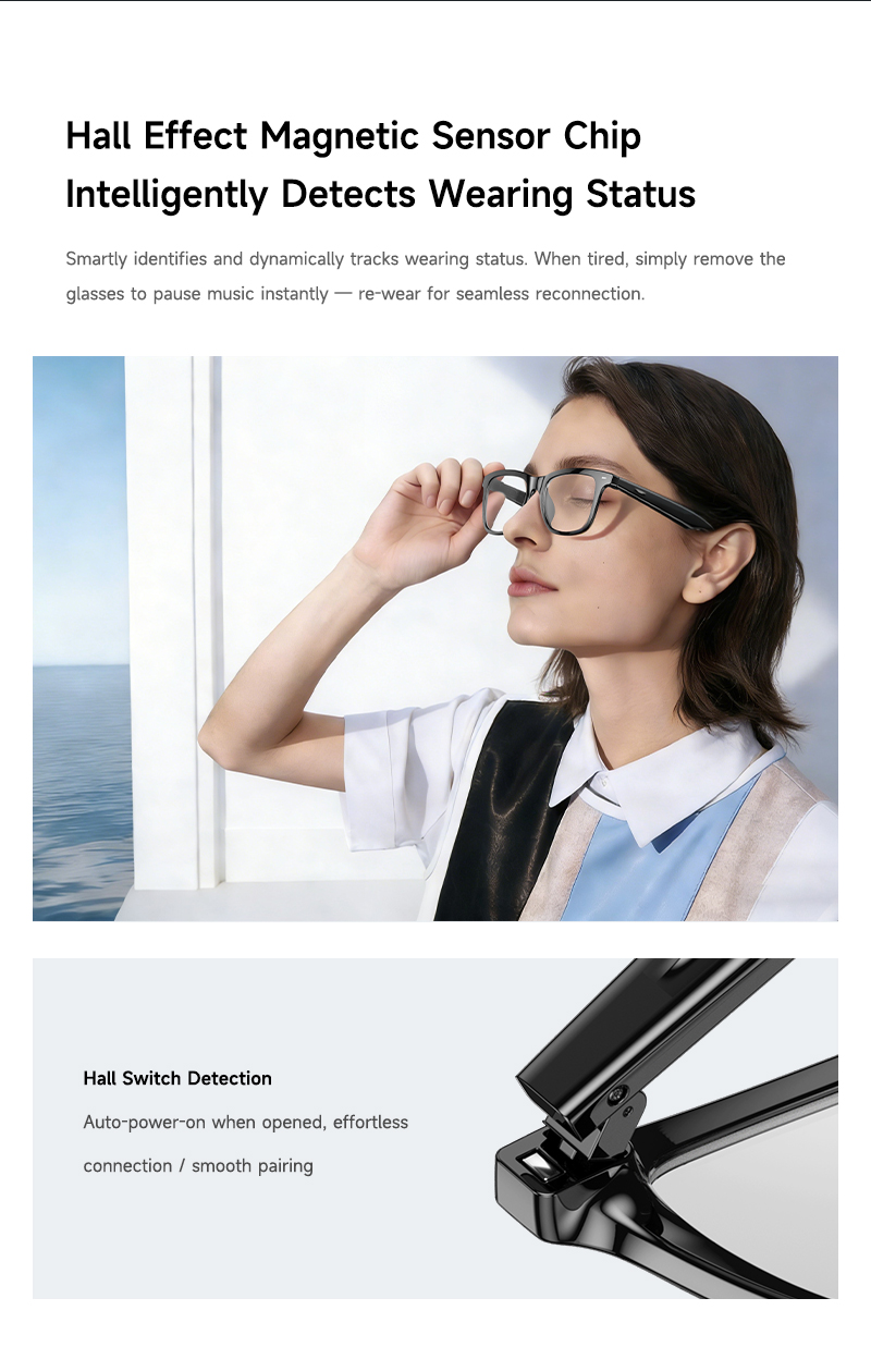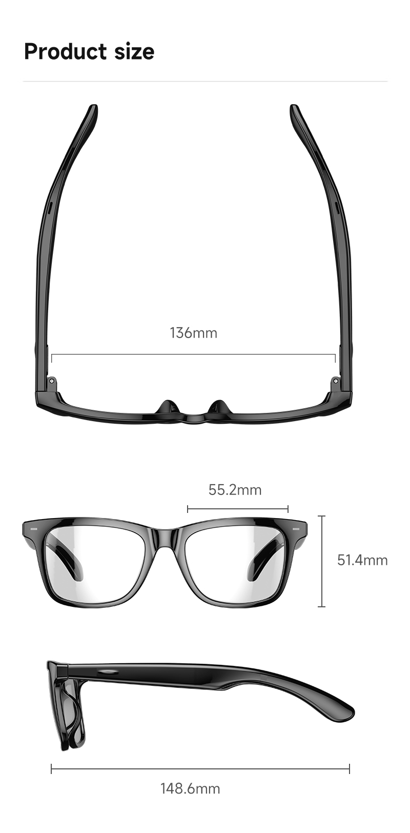 These AI smart audio glasses combine open-ear listening, Bluetooth 5.4 connectivity, and intelligent voice interaction in a lightweight TR90 frame. Equipped with ENC noise cancellation, they deliver clear calls even in noisy environments like commuting or cycling. The dual 90mAh battery design ensures long-lasting performance for music and calls. With auto power on/off via hall sensor, seamless connection, and touch control, they provide a truly hands-free experience. Ideal for travel, business
