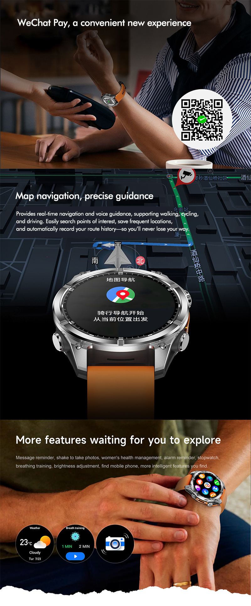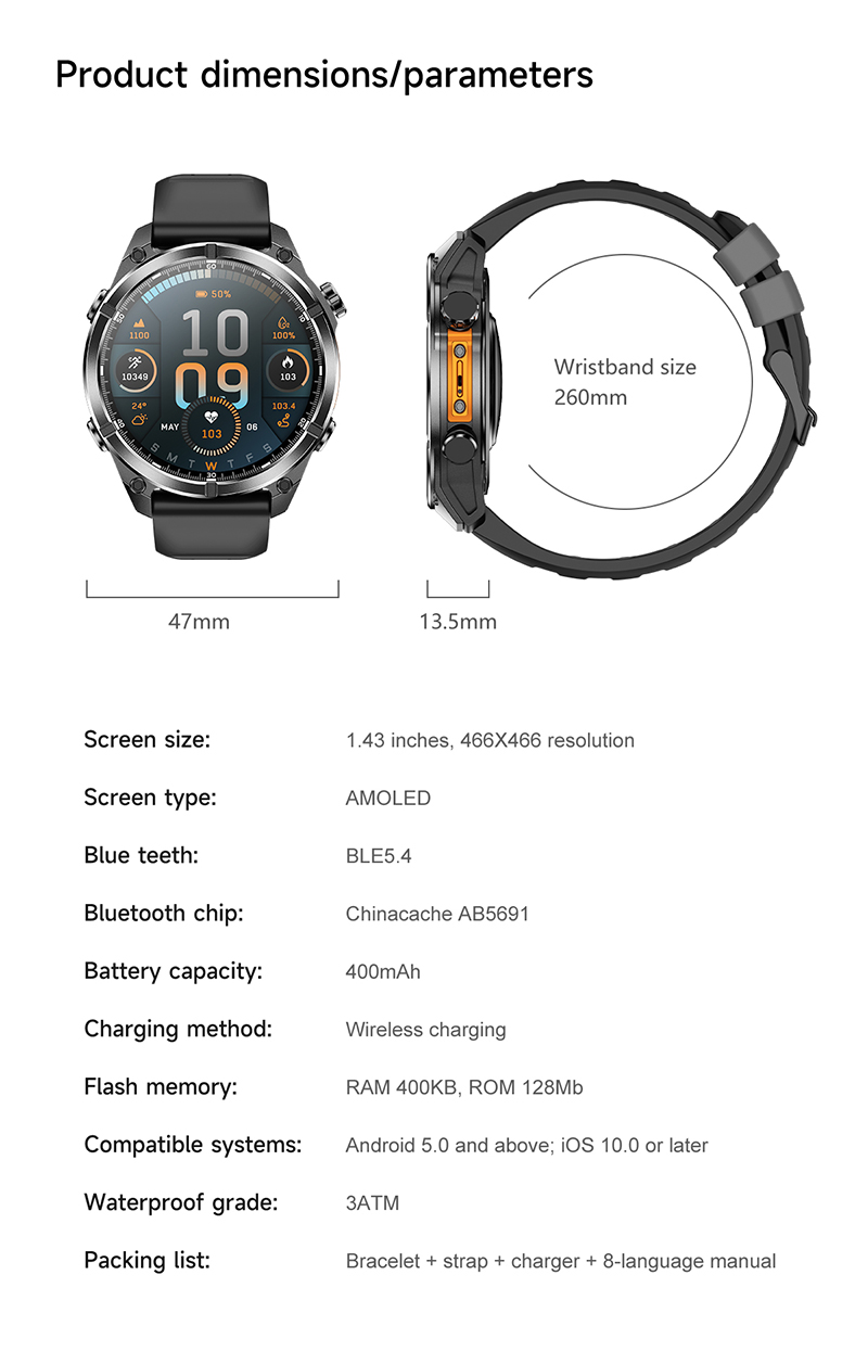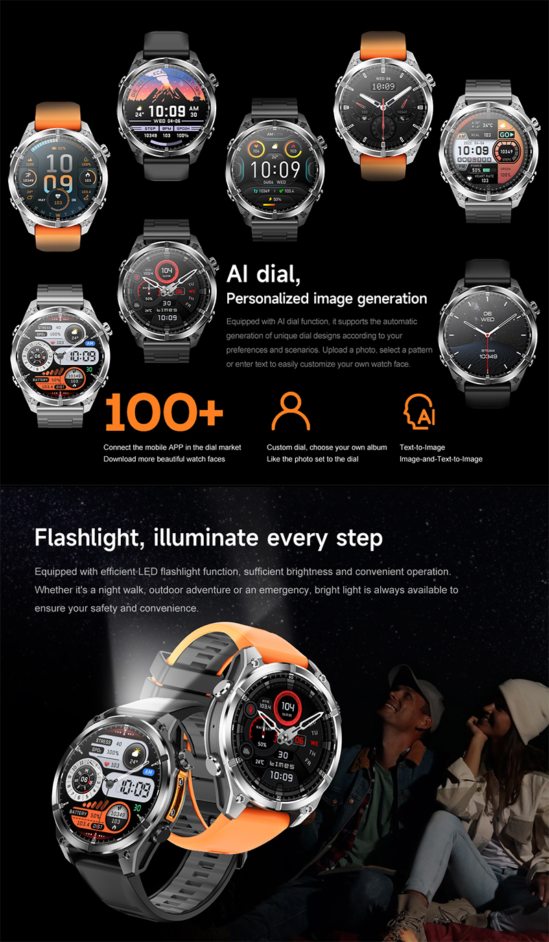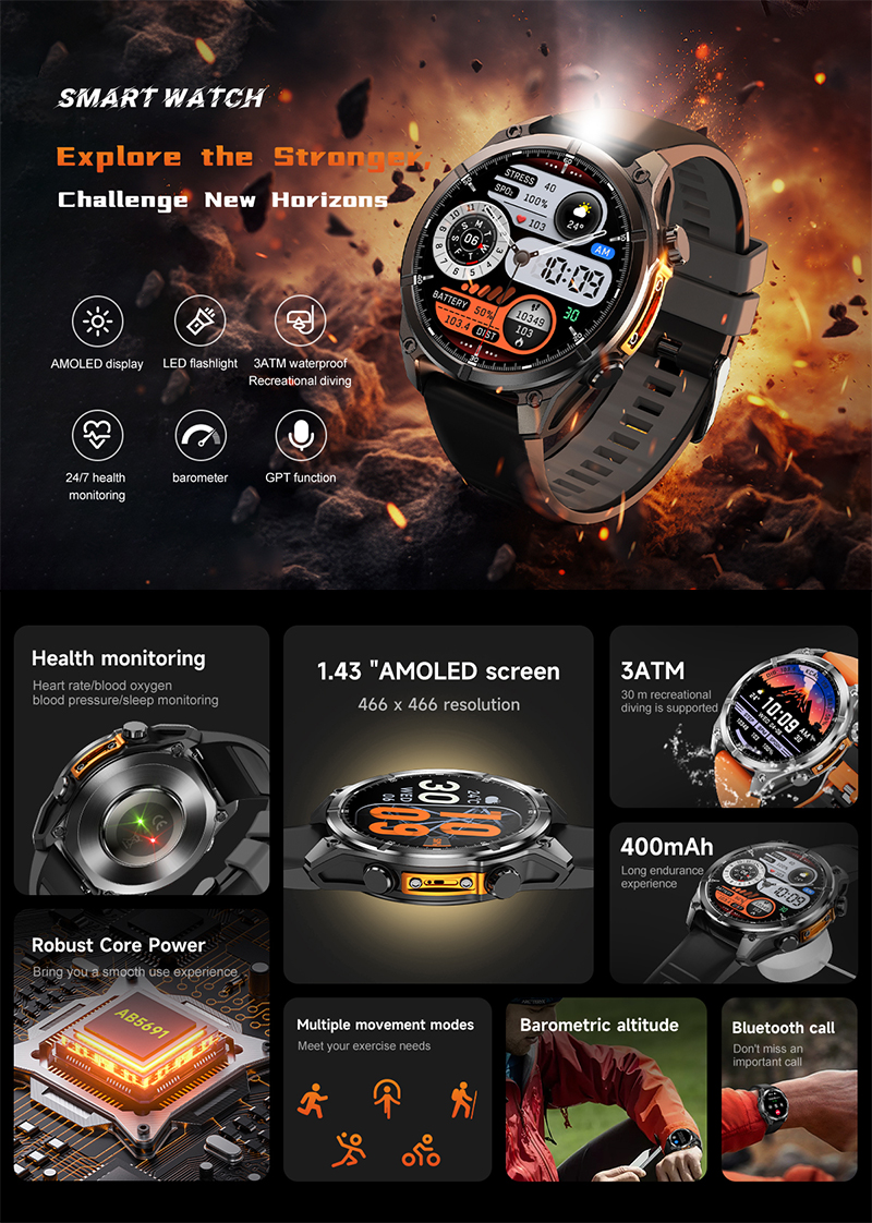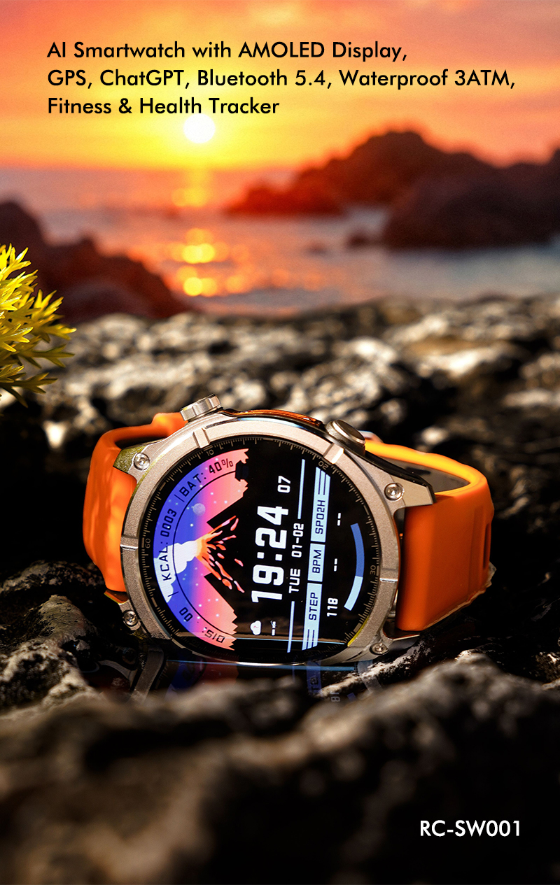 Discover the RC-SW001 AI Smartwatch—designed for explorers and achievers. Featuring a 1.43" AMOLED 466x466 HD screen, ChatGPT integration, wireless charging, and full metal casing. Track steps, heart rate, blood oxygen, sleep, and more with 3ATM water resistance for everyday use—even underwater up to 30m. Stay connected with smart notifications, GPS navigation, flashlight, WeChat Pay, and over 20 languages supported. Redefine your wrist tech experience.
