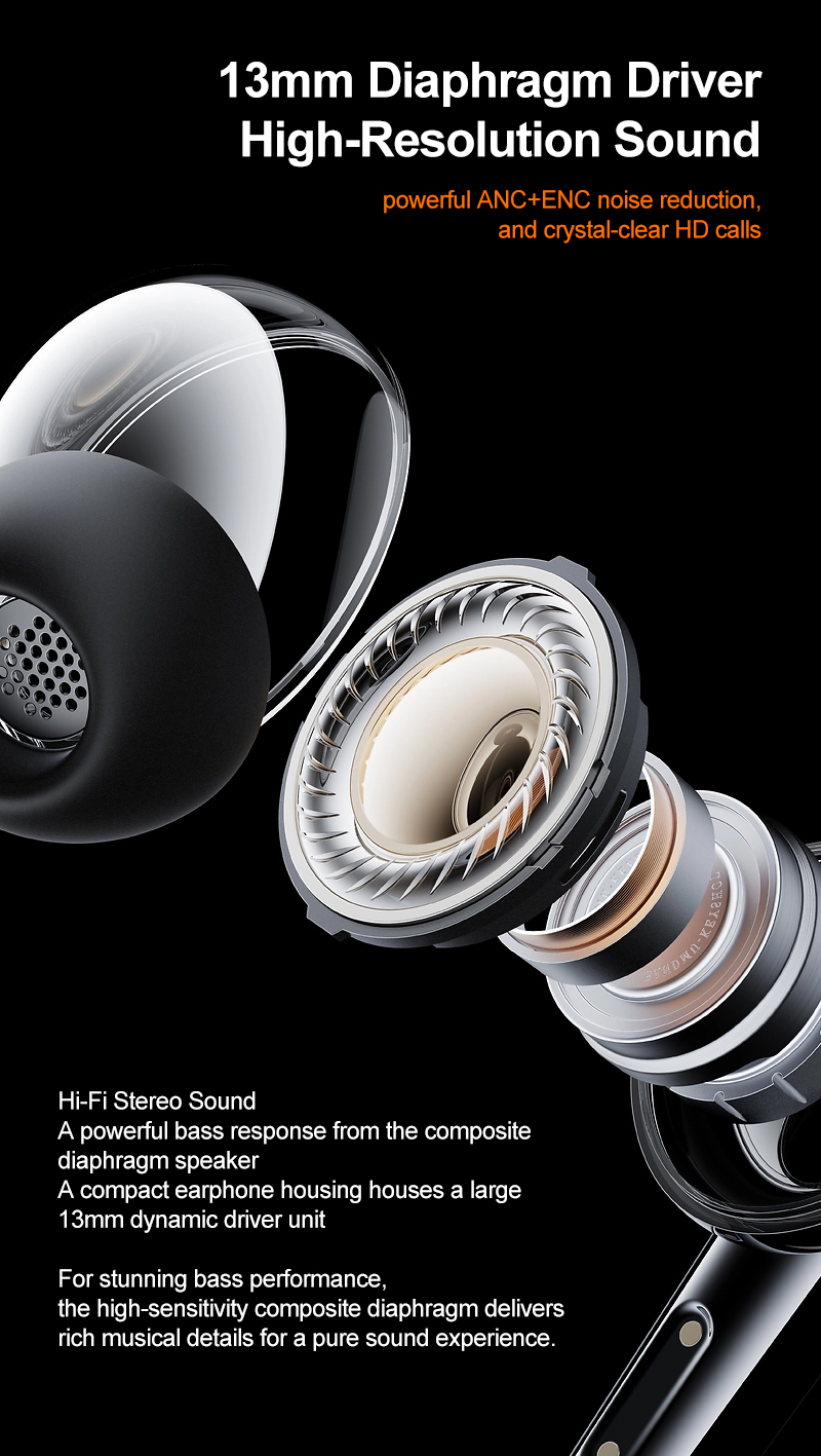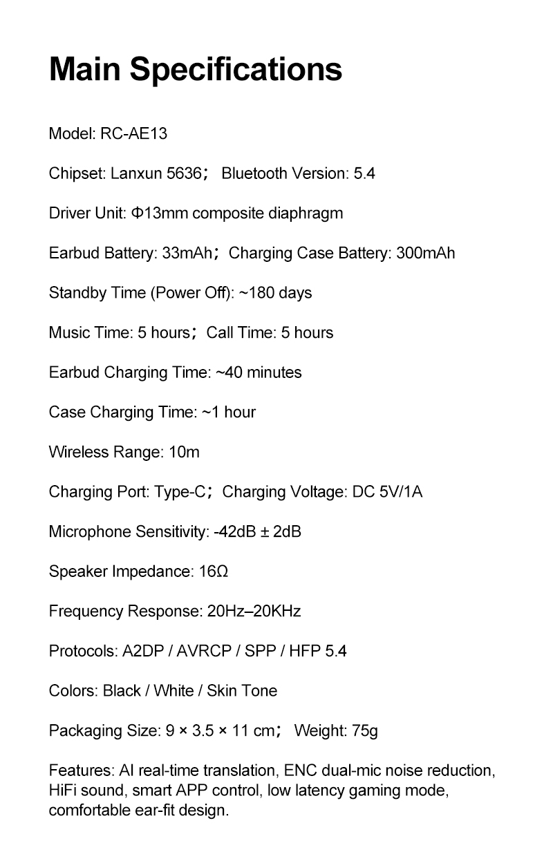 Experience next-level communication and audio with the RC-AE13 AI Translation Earbuds. Powered by the Lanxun 5636 chip and Bluetooth 5.4, they deliver fast connectivity, powerful ANC+ENC noise reduction, and crystal-clear HD calls. The 13mm composite diaphragm driver offers immersive sound, while the Smart App Link enhances customization. Enjoy 5 hours of music or talk time, ultra-long standby, and fast Type-C charging for all-day performance.