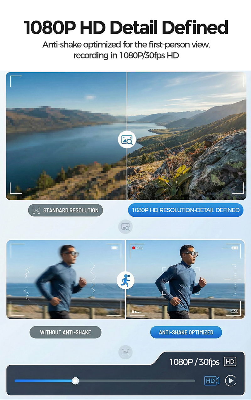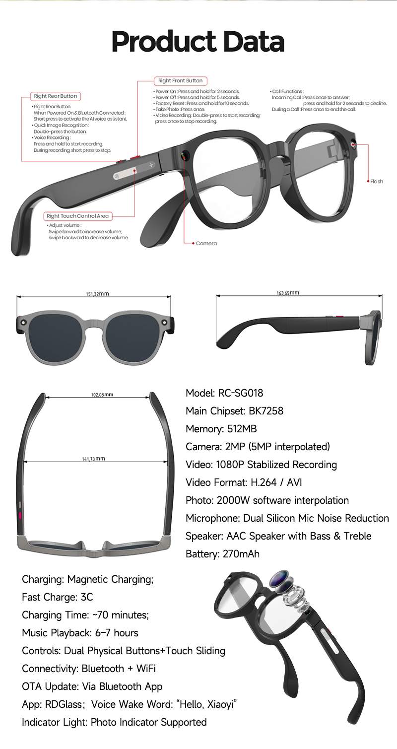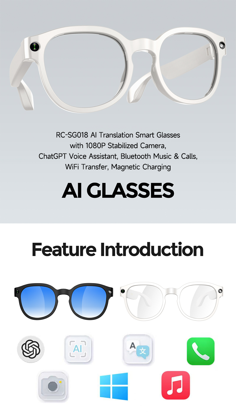 AI Translation Smart Glasses with 1080P Stabilized Camera, ChatGPT Voice Assistant, Bluetooth Music & Calls, WiFi Transfer, Magnetic Charging, RC-SG018