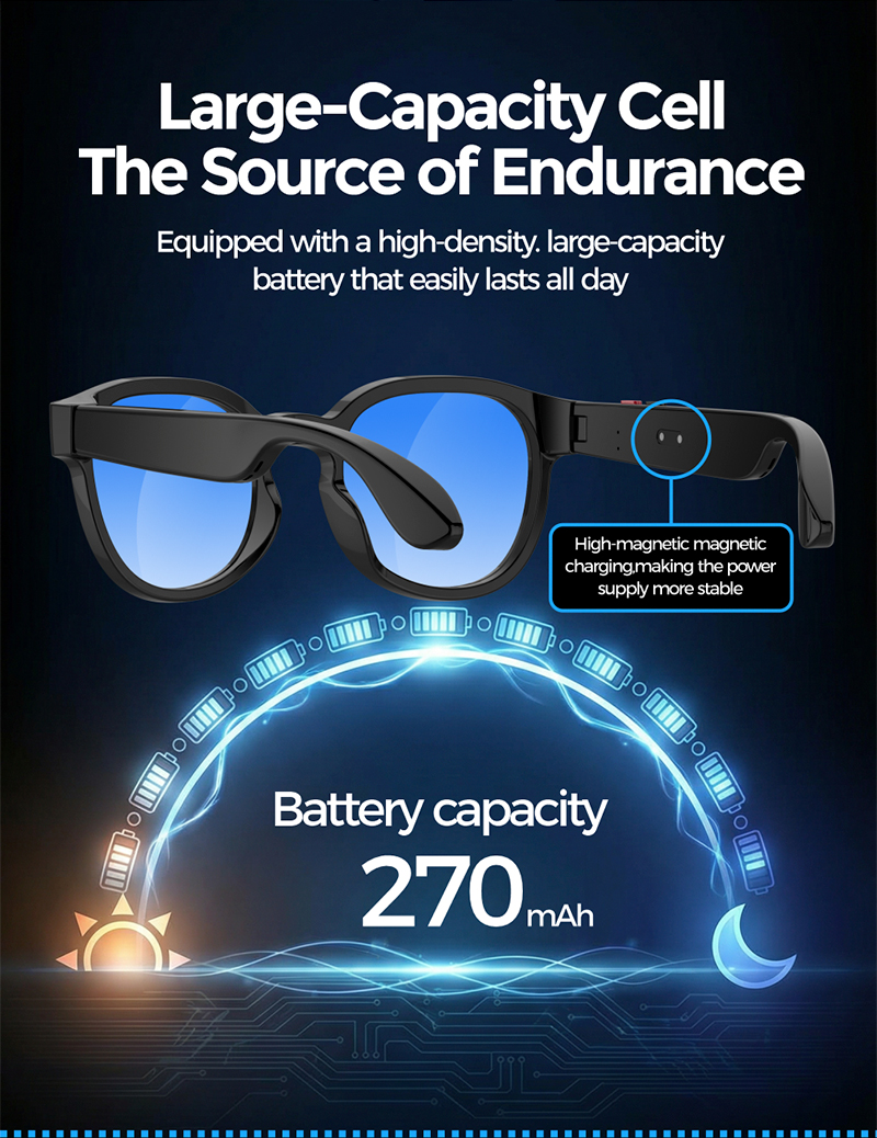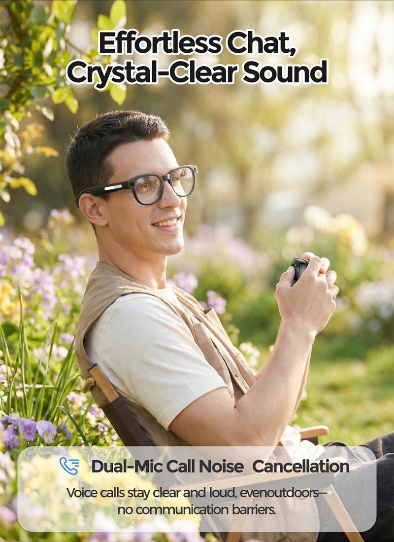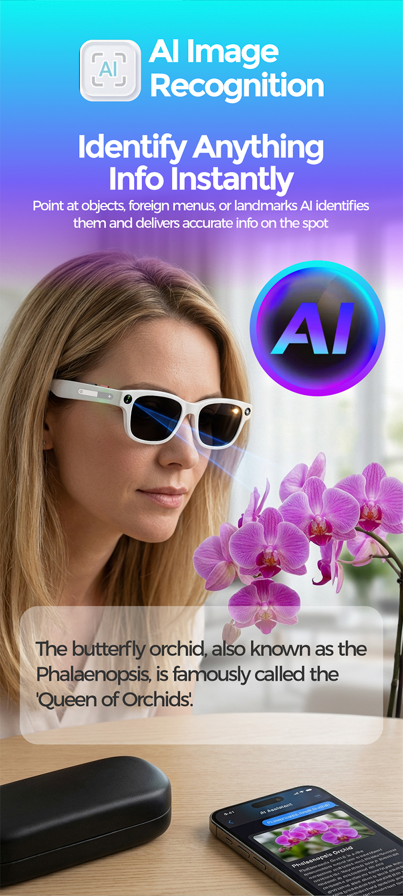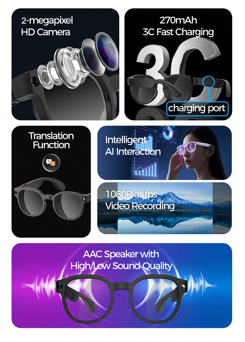 These AI Smart Glasses combine high-definition stabilized video recording, AI photo recognition, real-time translation, and ChatGPT voice interaction in a lightweight wearable design. Equipped with a 5MP interpolated camera, dual noise-reduction microphones, AAC stereo speakers, and WiFi file transfer, they let you capture moments, enjoy music, and handle calls hands-free. Magnetic fast charging, touch & physical controls, OTA updates, and cross-platform Bluetooth compatibility