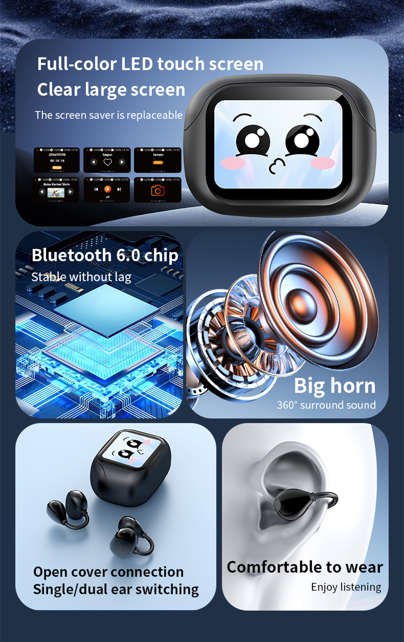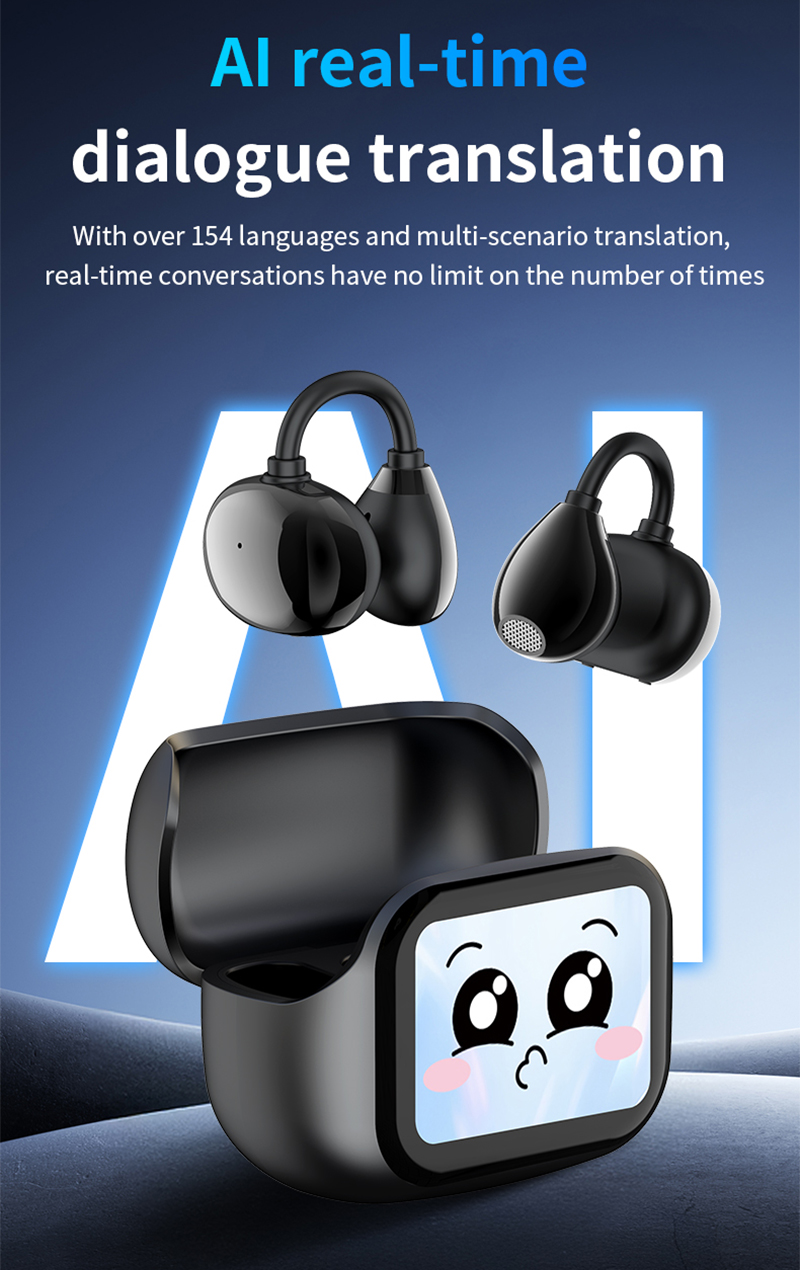 Experience next-level smart audio with the A18 PLUS AI Translation Earbuds. Featuring a full-color LED touch screen, real-time AI translation, ENC+ANC dual noise reduction, and ergonomic non-in-ear design for pressure-free comfort. Enjoy crystal-clear calls, immersive music, and 6–8 hours of playtime on a single charge. The 300mAh charging case ensures all-day listening. Stay connected, stylish, and effortlessly in control with A18 PLUS—your AI-powered companion for music and communication.