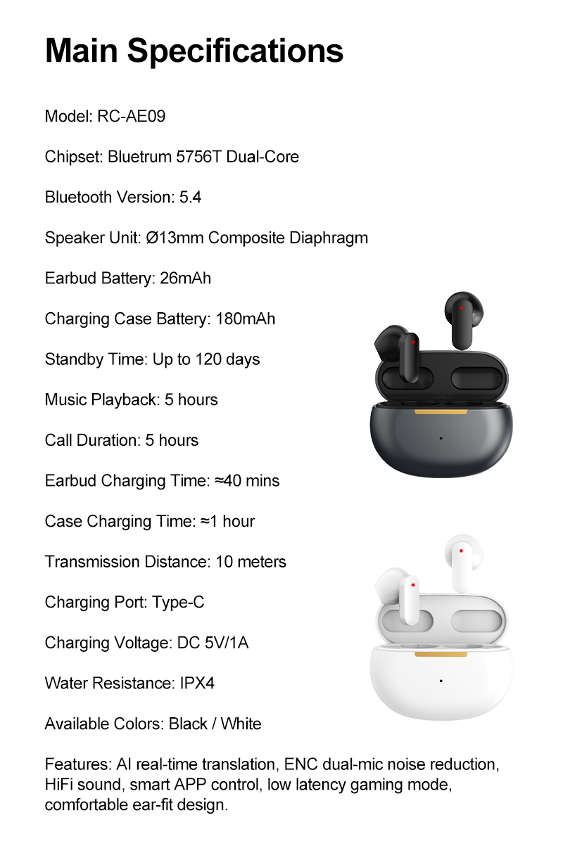 Smart AI Translation Wireless Earbuds | Dual-Mic ENC Noise Cancellation | HiFi Bass Composite Driver | Bluetooth 5.4 Low-Latency Gaming Earphones | 120-Day Standby | APP Smart Control RC-AE09