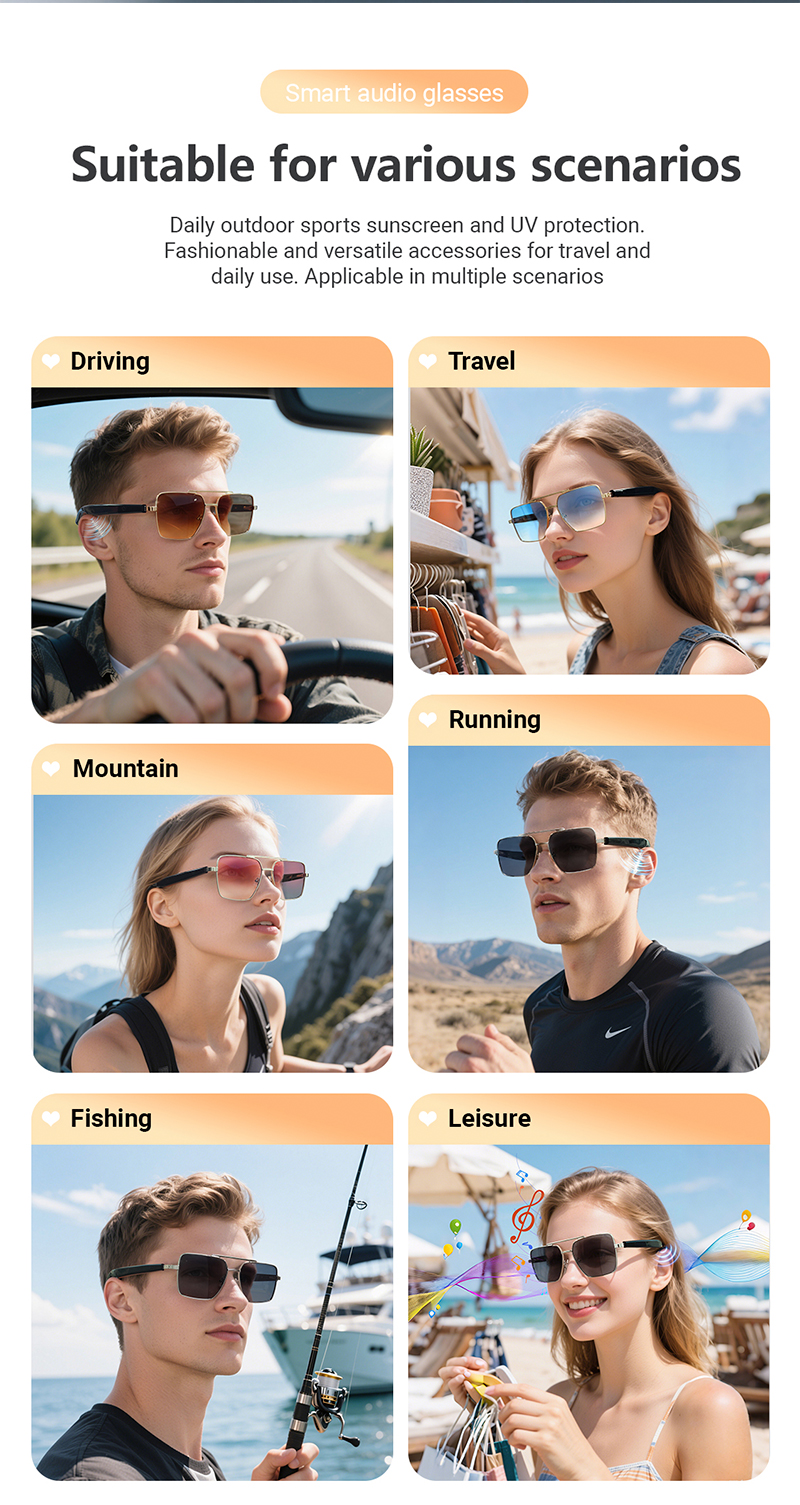 Experience next-generation wearable technology with our Smart AI Translator Bluetooth Sunglasses. Designed for driving, cycling, fishing, mountain climbing, traveling, business, and daily use, these glasses combine style with powerful functions. Enjoy Bluetooth calling, music playback, voice assistant, multi-language AI translation (customizable), and remote camera control. With UV400 anti-glare protection, life waterproof design, lightweight ABS+PC+metal frame, and 50mAh dual batteries.